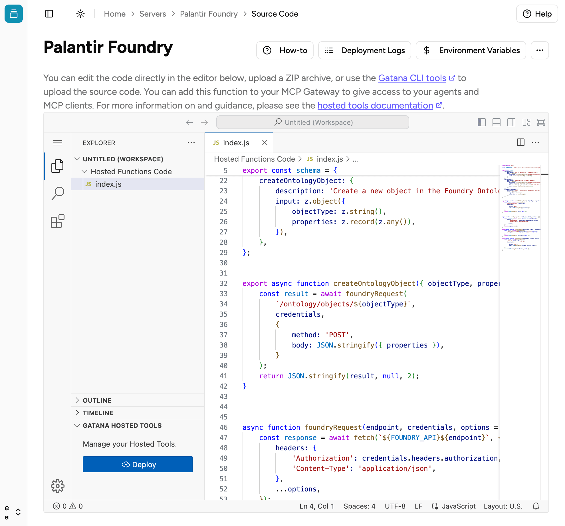 Hosted Tools – Write and deploy JavaScript code and expose as MCP tools. Use inline web-editor or CLI tool to deploy